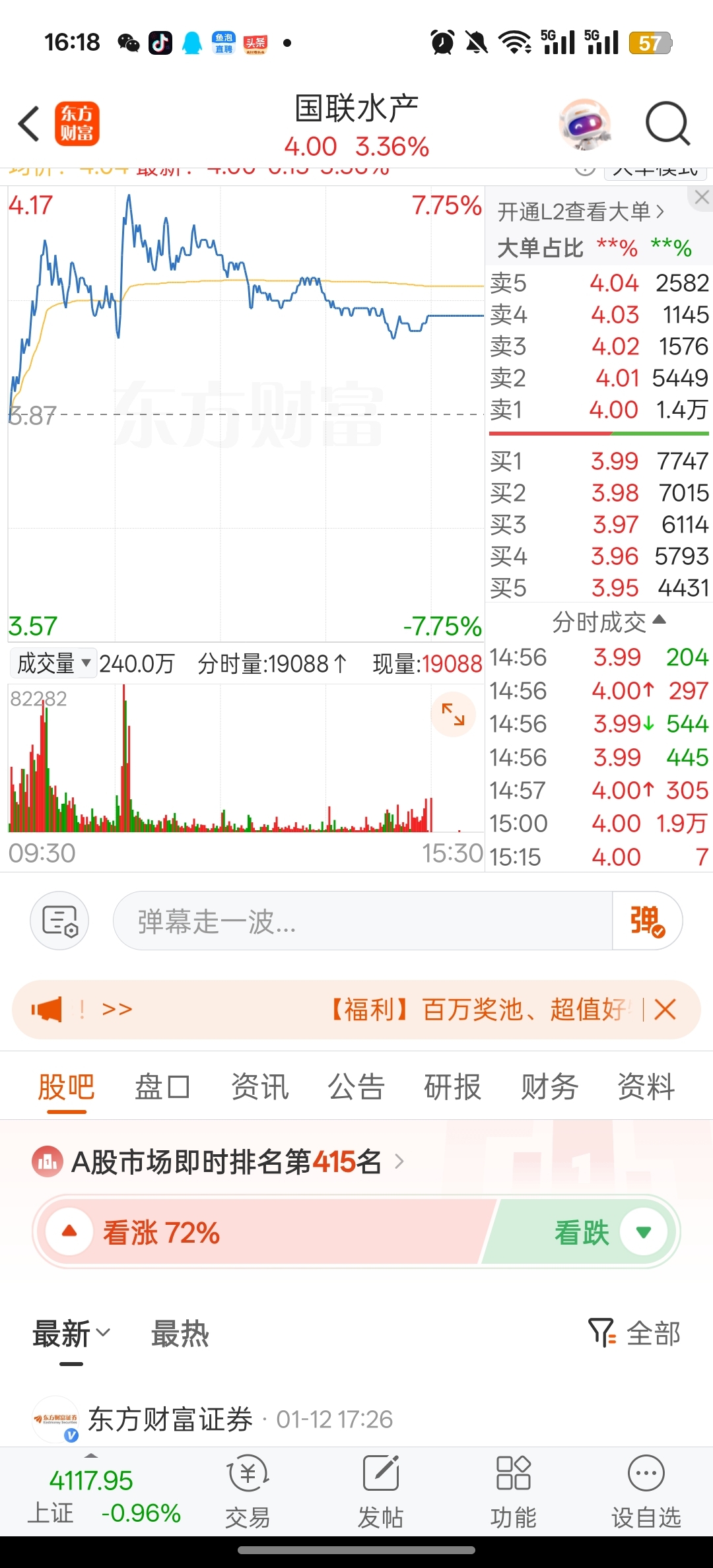 $国联水产(SZ300094)$ 百分之72的看涨,老乡们都疯了么