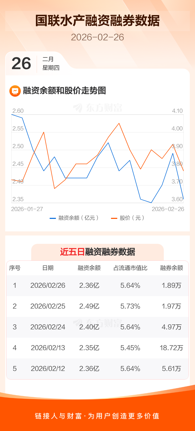 交易所最新数据显示,国联水产于2026年2月26日获融资买入2668.23万元,融资偿还3998.12万元,当日融资净偿还1329.89万元。目前,该股融资余额2.36亿,占流通市值比例为5.64%。