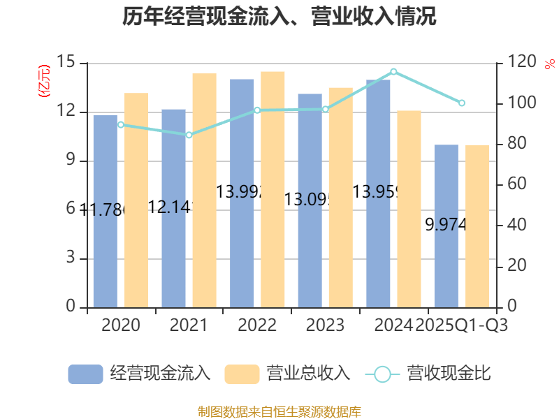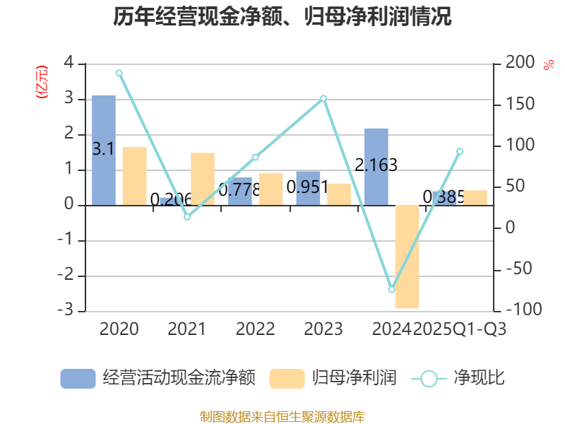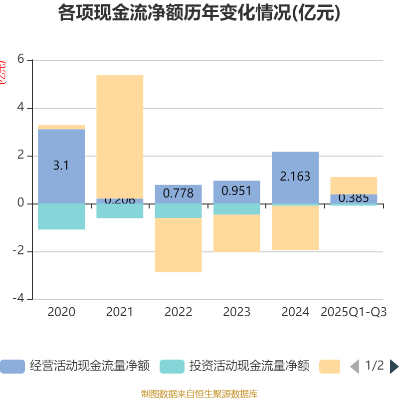 2025年前三季度,公司经营活动现金流净额为3853.84万元,同比下降66.42%;筹资活动现金流净额7196.72万元,同比增加1.76亿元;投资活动现金流净额-888.01万元,上年同期为-430.38万元。