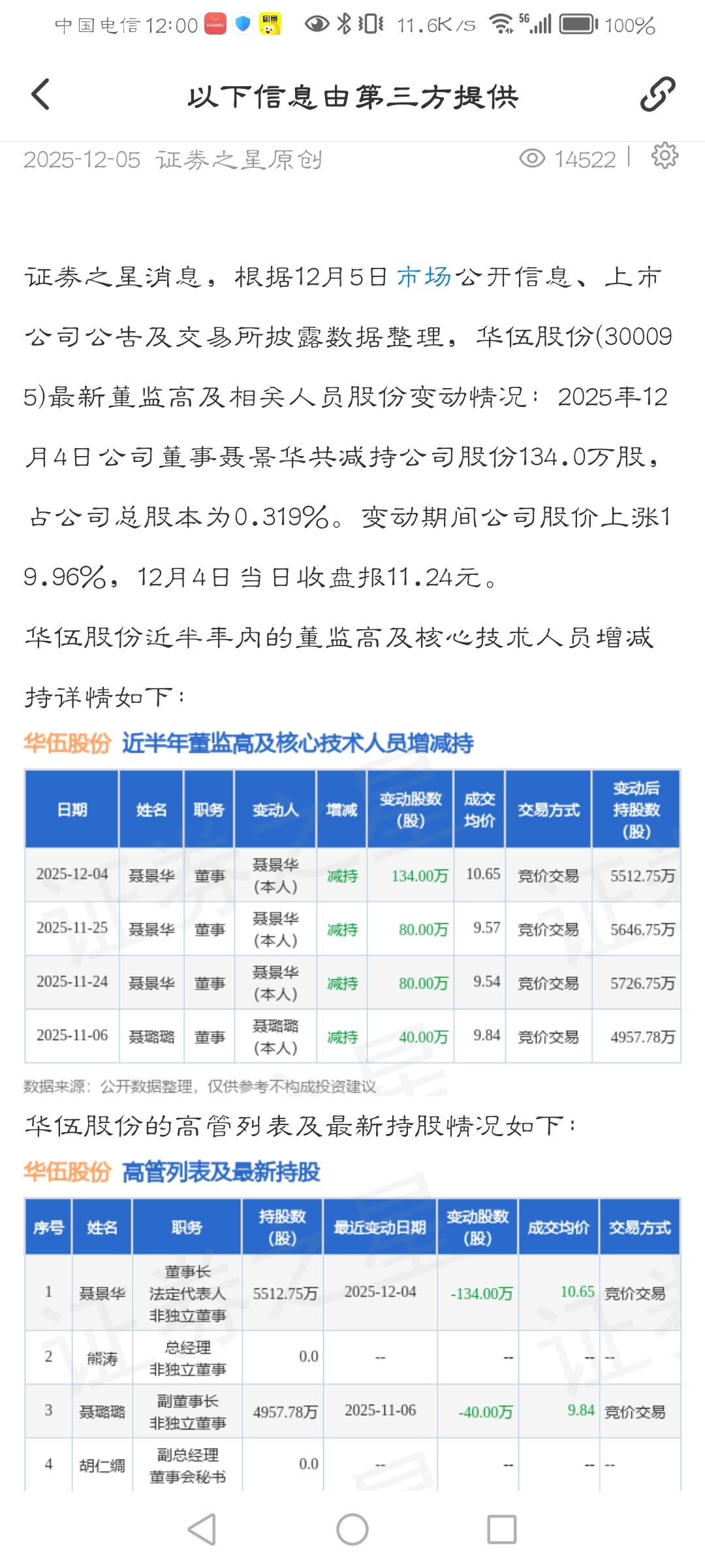 $华伍股份(SZ300095)$ 聂景华12/4减持134万价格11.24这几天都是聂家减持好时机,走这么弱就是大股东减持的结果?
