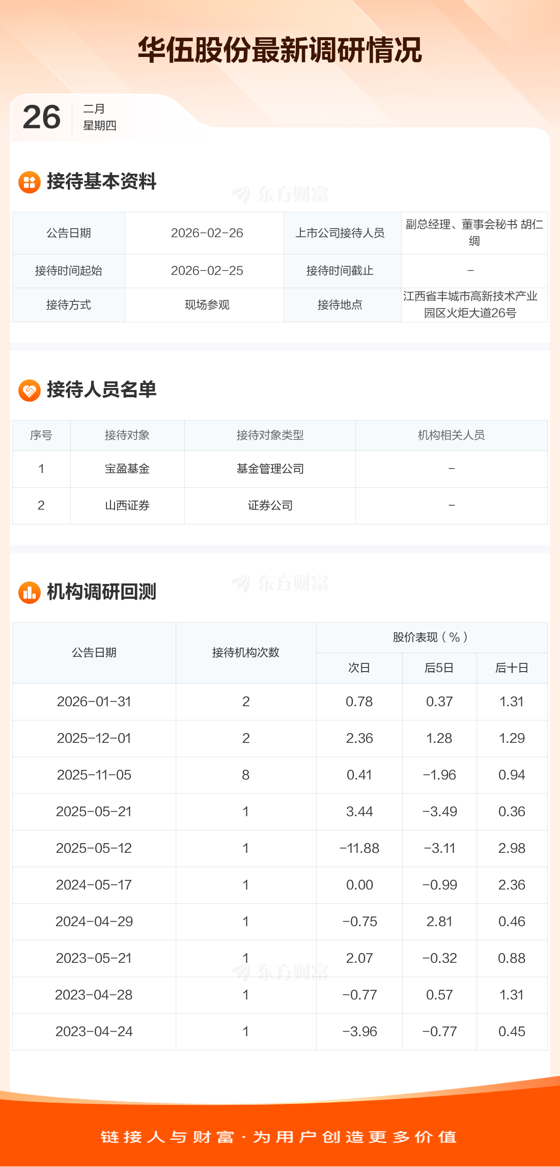 华伍股份2月26日公告称,2月25日接待宝盈基金等2家机构调研。接待人员包括副总经理、董事会秘书 胡仁绸。