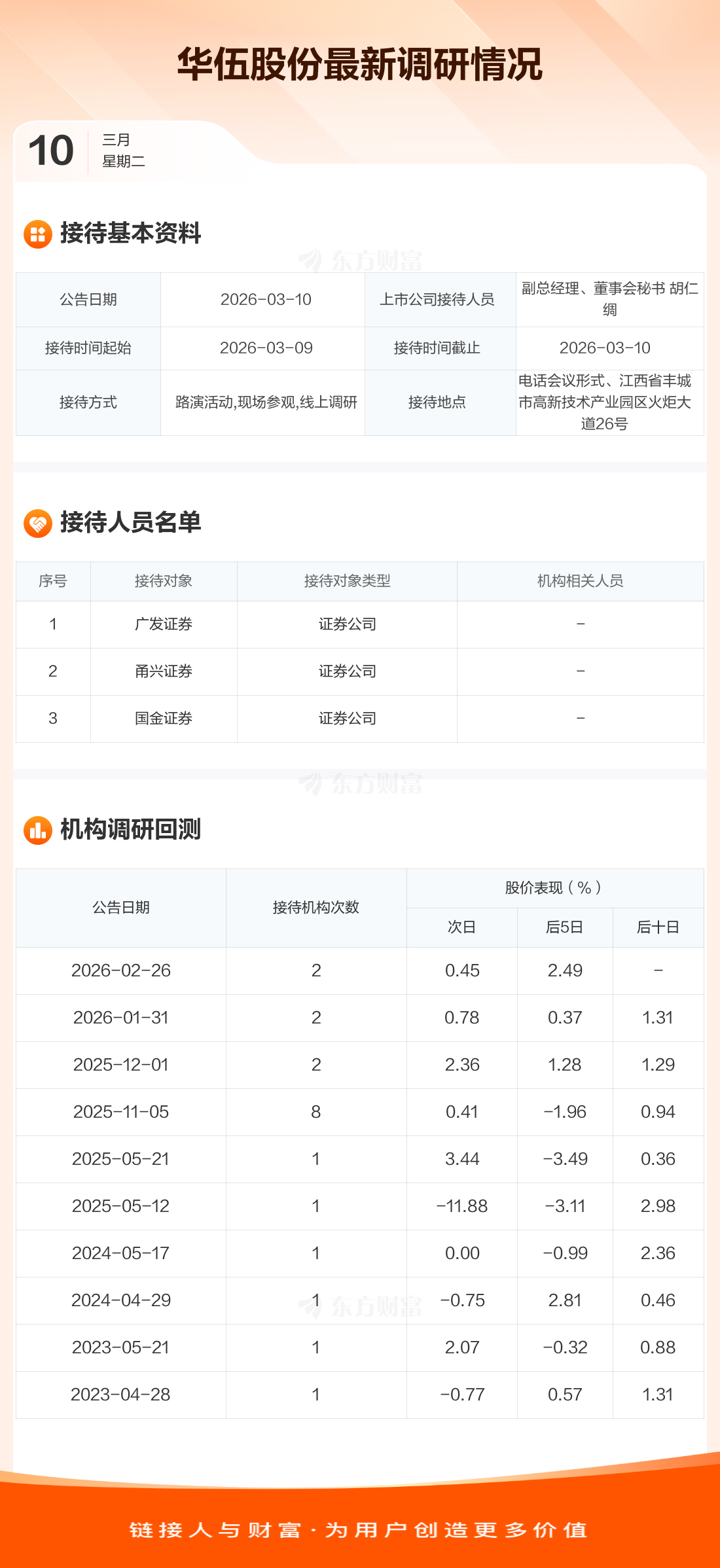 华伍股份3月10日公告称,3月9日至3月10日接待广发证券等3家机构调研。接待人员包括副总经理、董事会秘书 胡仁绸。