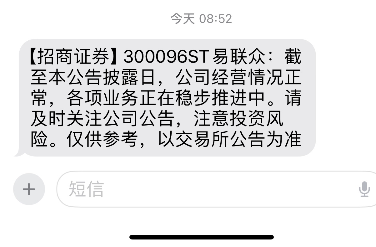 $ST易联众(SZ300096)$ 大家看看,给我发短信,是什么意思