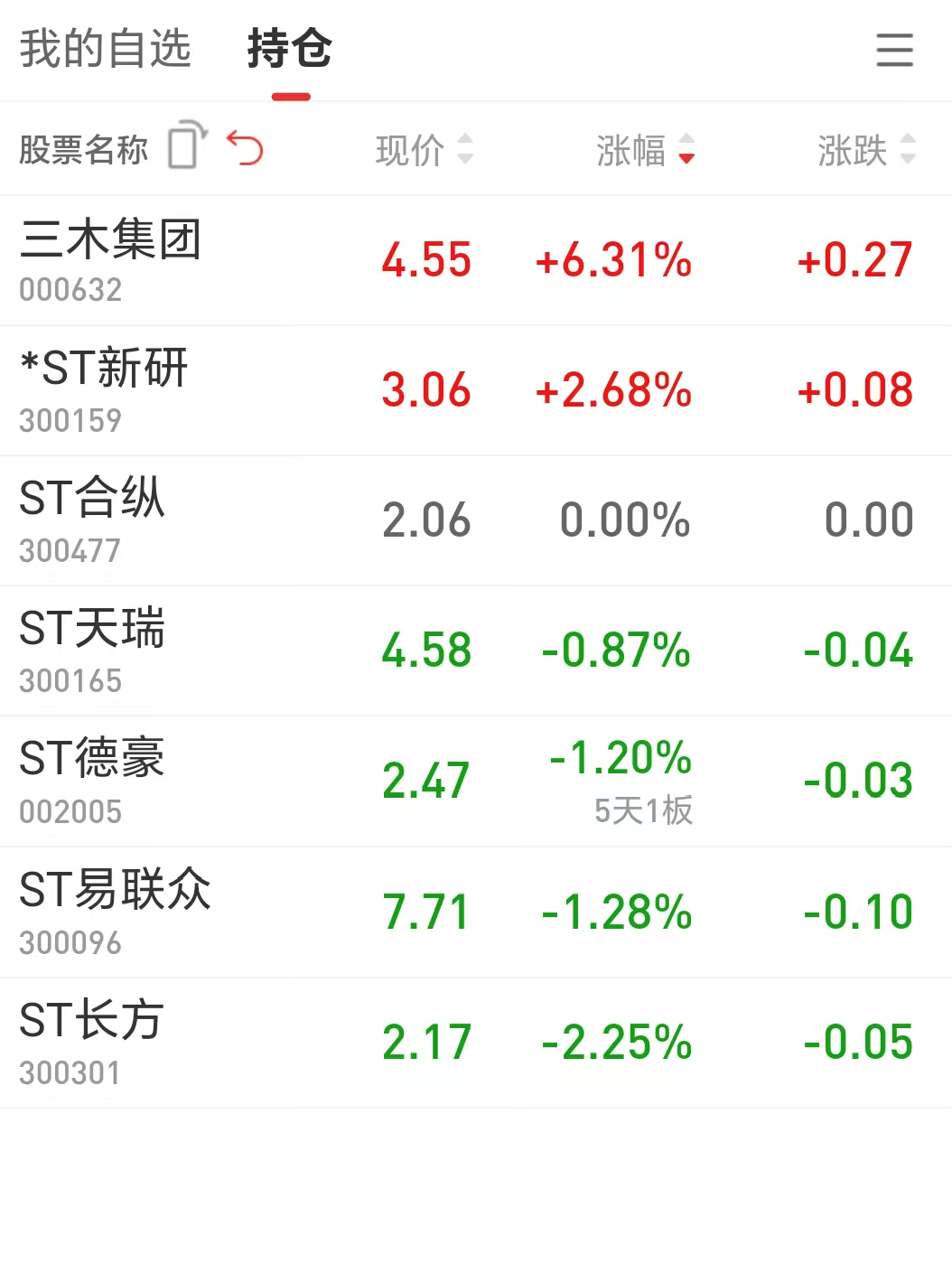 午盘持仓一半多还绿着.......指数上扬对ST相当不友好......