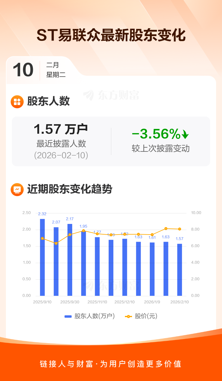 ST易联众:截至2月10日最新股东户数1.57万户,较上期减少3.56%