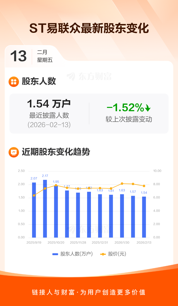 ST易联众:截至2月13日最新股东户数1.55万户,较上期减少1.52%