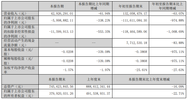 2025年前三季度,公司实现营业总收入1.32亿元,同比下降63.07%;归母净利润亏损1.12亿元,上年同期盈利1276万元;扣非净利润亏损1.18亿元,上年同期盈利1223万元。