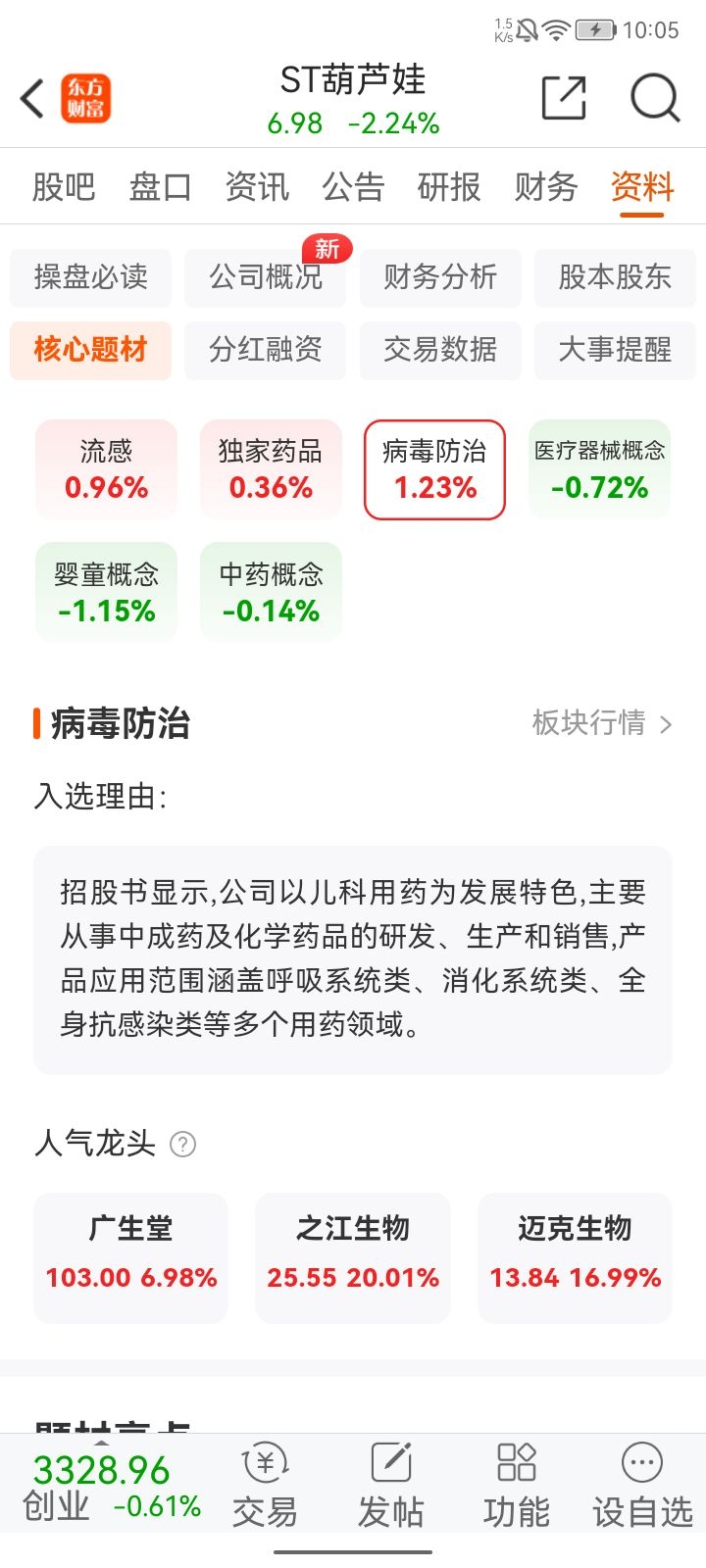 ST葫芦娃儿童病毒防治板块行情入选理由:招股书显示,公司以儿科用药为发展特色,主要从事中成药及化学药品的研发、生产和销售,产品应用范围涵盖呼吸系统类、消化系统类、全身抗感染类等多个用药领域。人气龙头