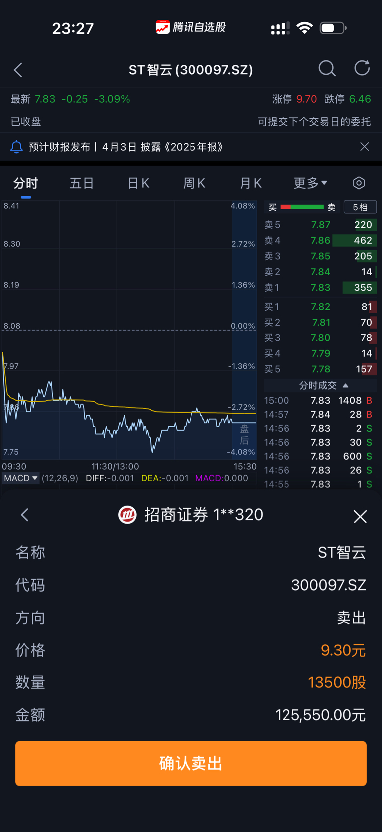 $ST智云(SZ300097)$ 前几天走弱叠加前面几家申请摘帽之后走势都不好出得就剩底仓了,明天来个好心人把我筹码收了