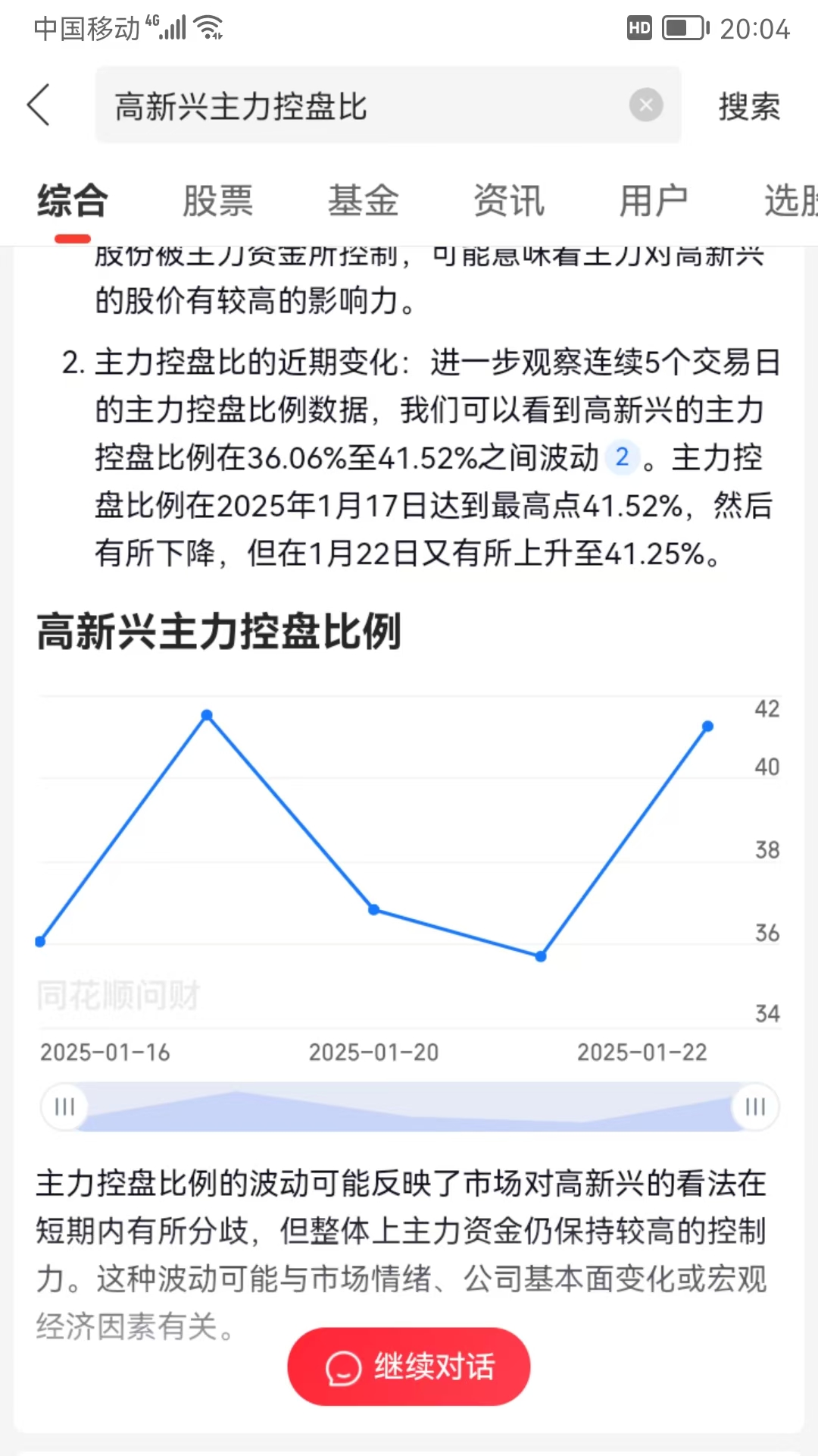 1月22日高新兴主力控盘比41.25%。业绩预亏,股价大跌,主力控盘比连续五日3