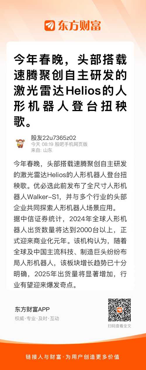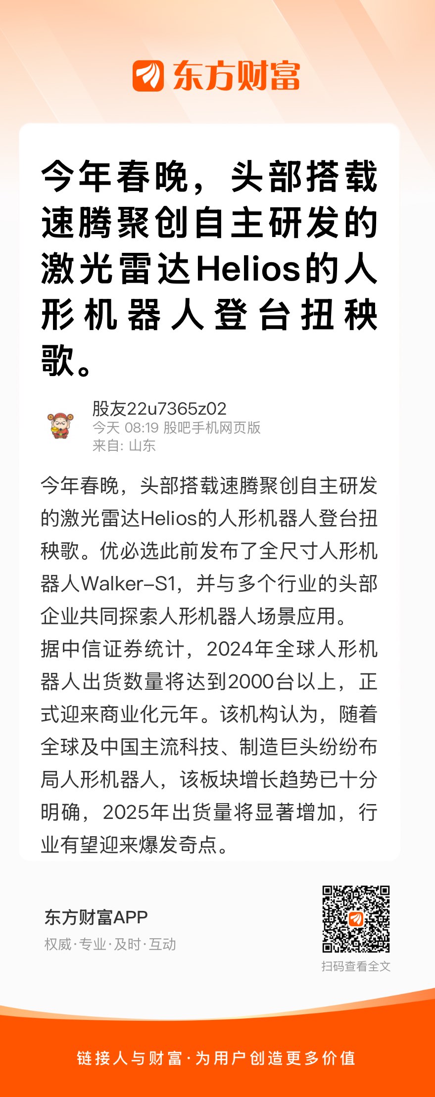 今年春晚,头部搭载速腾聚创自主研发的激光雷达Helios的人形机器人登台扭秧歌。优必选此前发布了全尺寸人形机器人Walker-S1,并与多个行业的头部企业共同探索人形机器人场景应用。