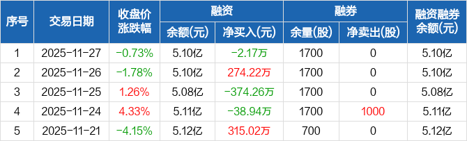 高新兴:融资净偿还2.17万元,融资余额5.1亿元(11-27)