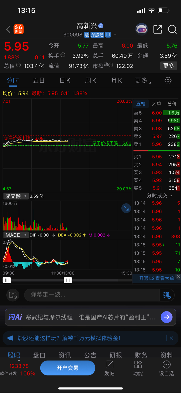 $高新兴(SZ300098)$ 我衣服穿的是8849,裤子穿的是 9980 …… 5.98 压着9980手 !