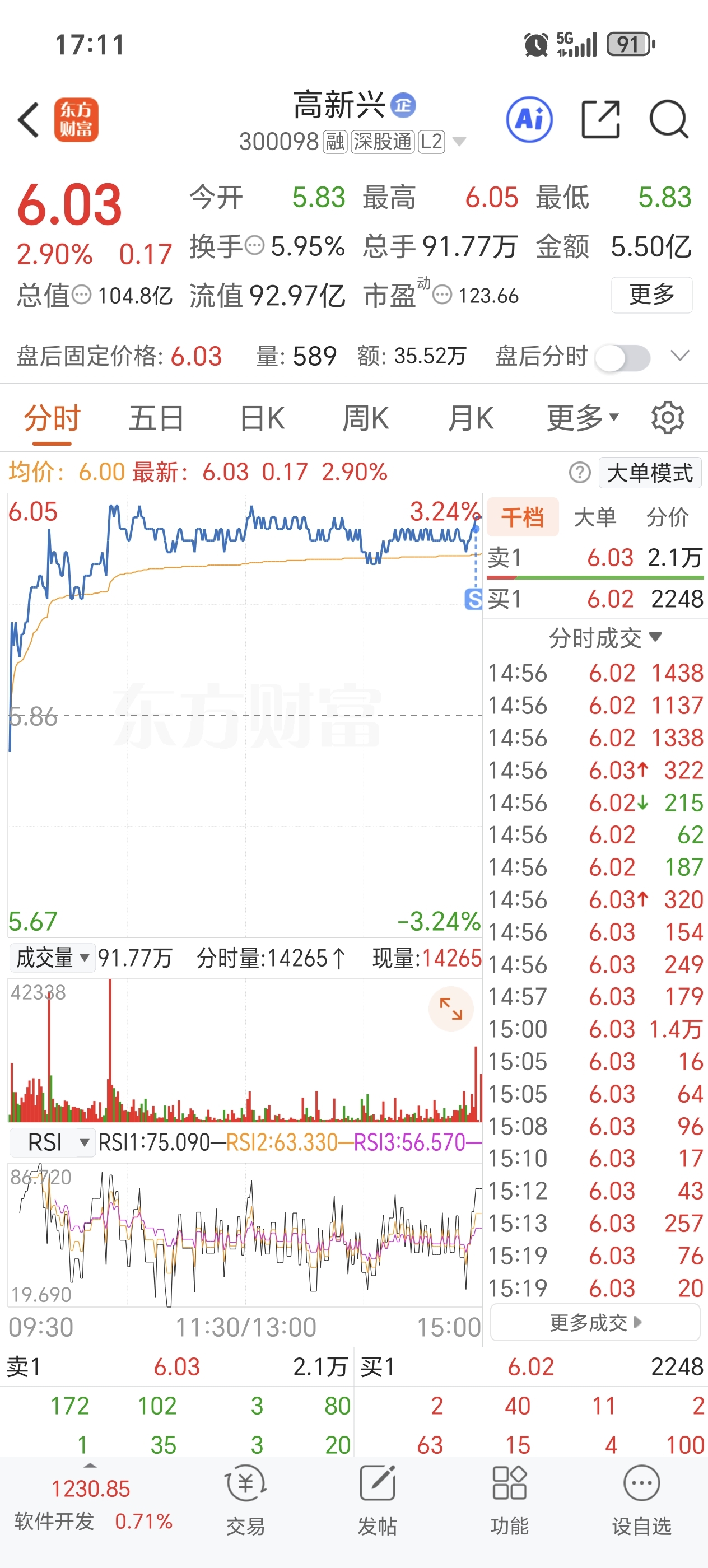 $高新兴(SZ300098)$ 尾盘清掉,星期一急跌再买回来,就这个feel,倍儿爽
