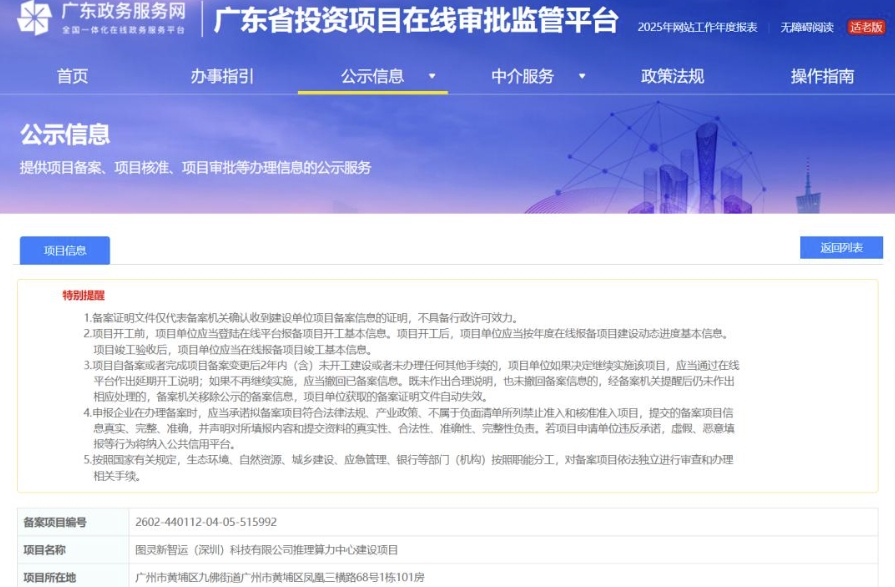 备案信息显示,该项目位于广州市黄埔区九佛街道广州市黄埔区凤凰三横路68号1栋101房,规划建设不低于4000PFlops@FP16 AI推理算力资源(约合2950个2.5kW标准机架), 建筑面积约5000㎡,占地面积约9000㎡。