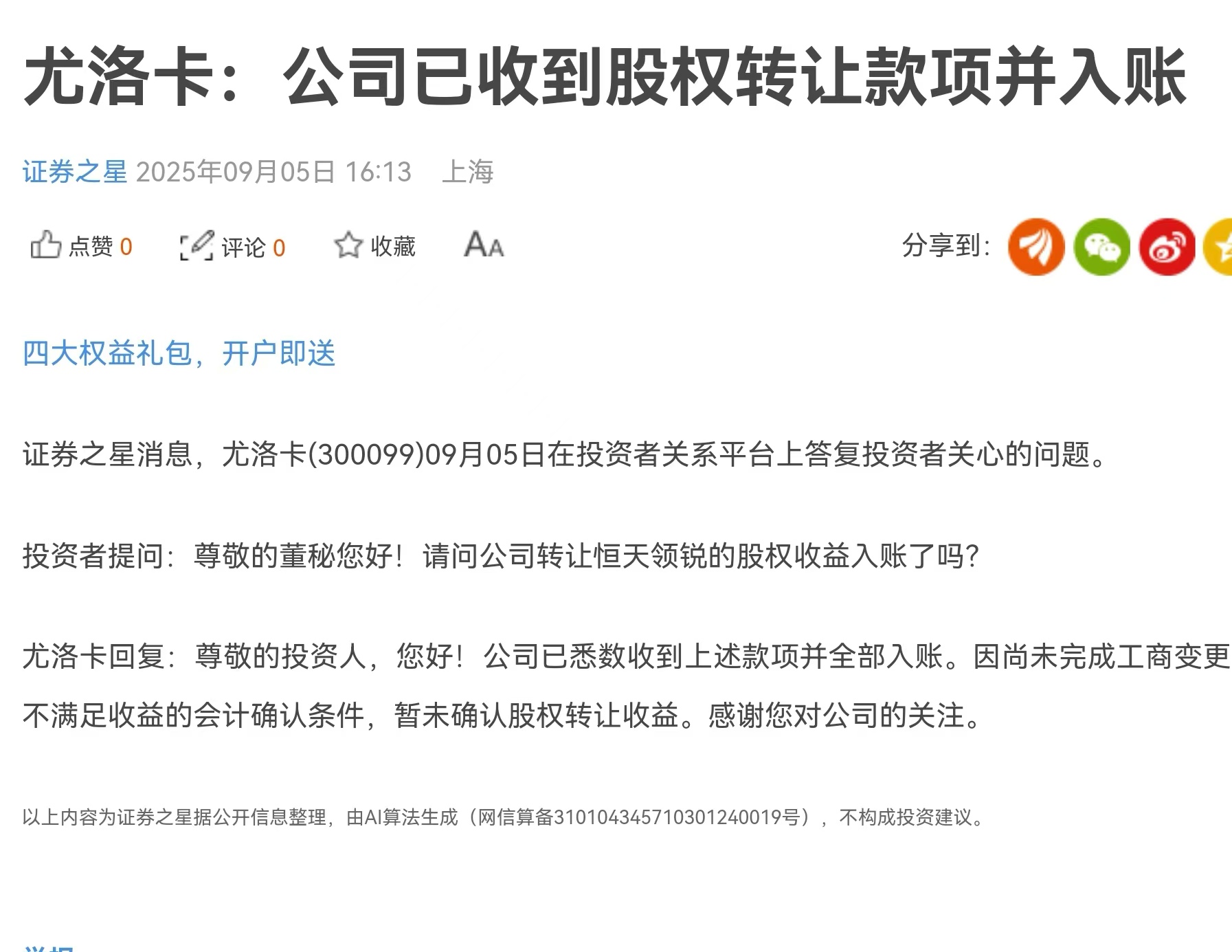 印象中,公司说股权转让款将在三季报入表,这又推迟了…?