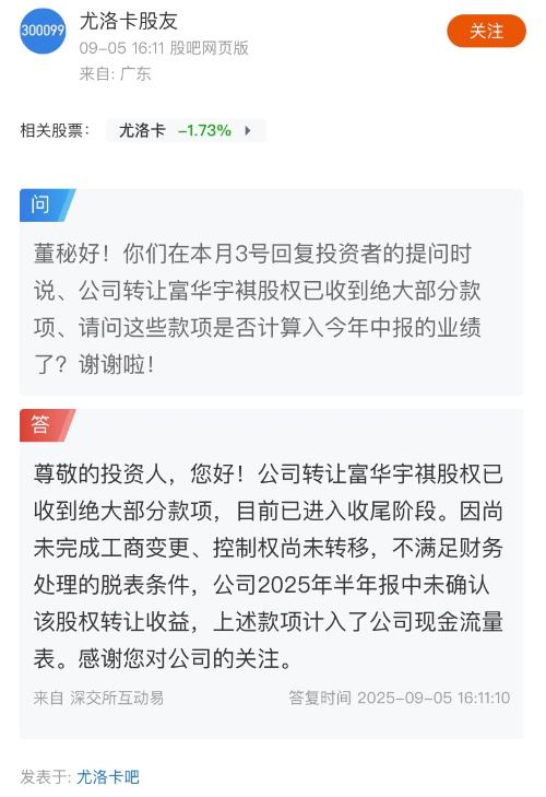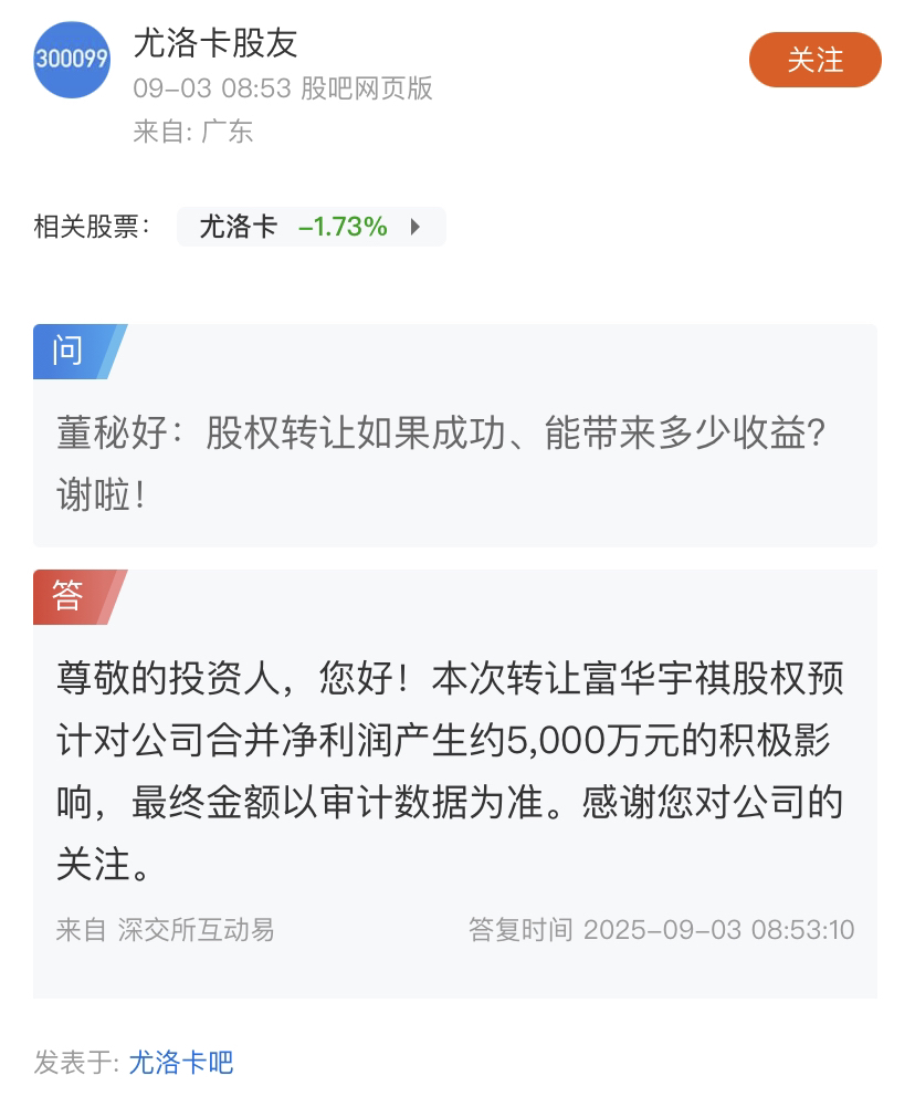 尤洛卡四季度5000万利润到账,尊敬的投资人,您好!本次转让富华宇祺股权预计对公