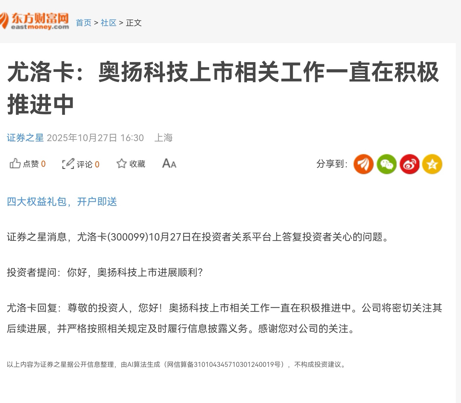 参股公司奥扬科技即将上市,尤洛卡马到功成…