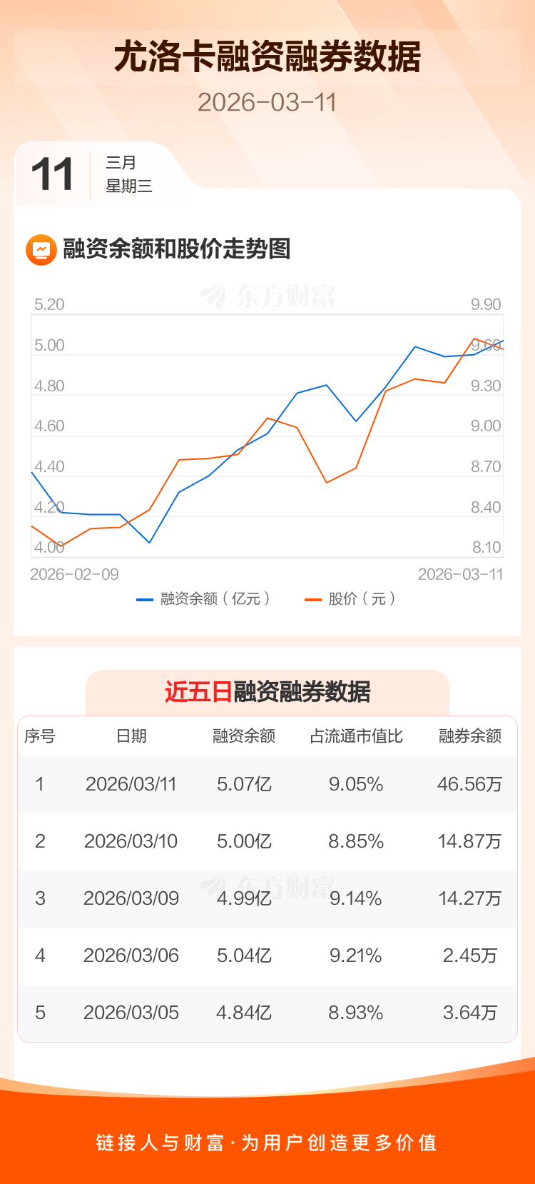 交易所最新数据显示,尤洛卡于2026年3月11日获融资买入3885.37万元,融资偿还3185.26万元,当日融资净买入700.11万元。目前,该股融资余额5.07亿,占流通市值比例为9.05%。