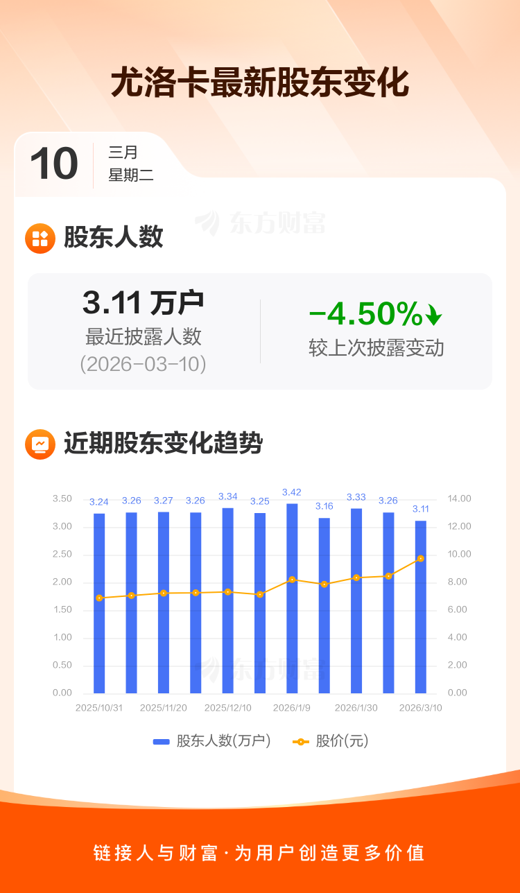 尤洛卡:截至3月10日最新股东户数3.11万户,较上期减少4.50%