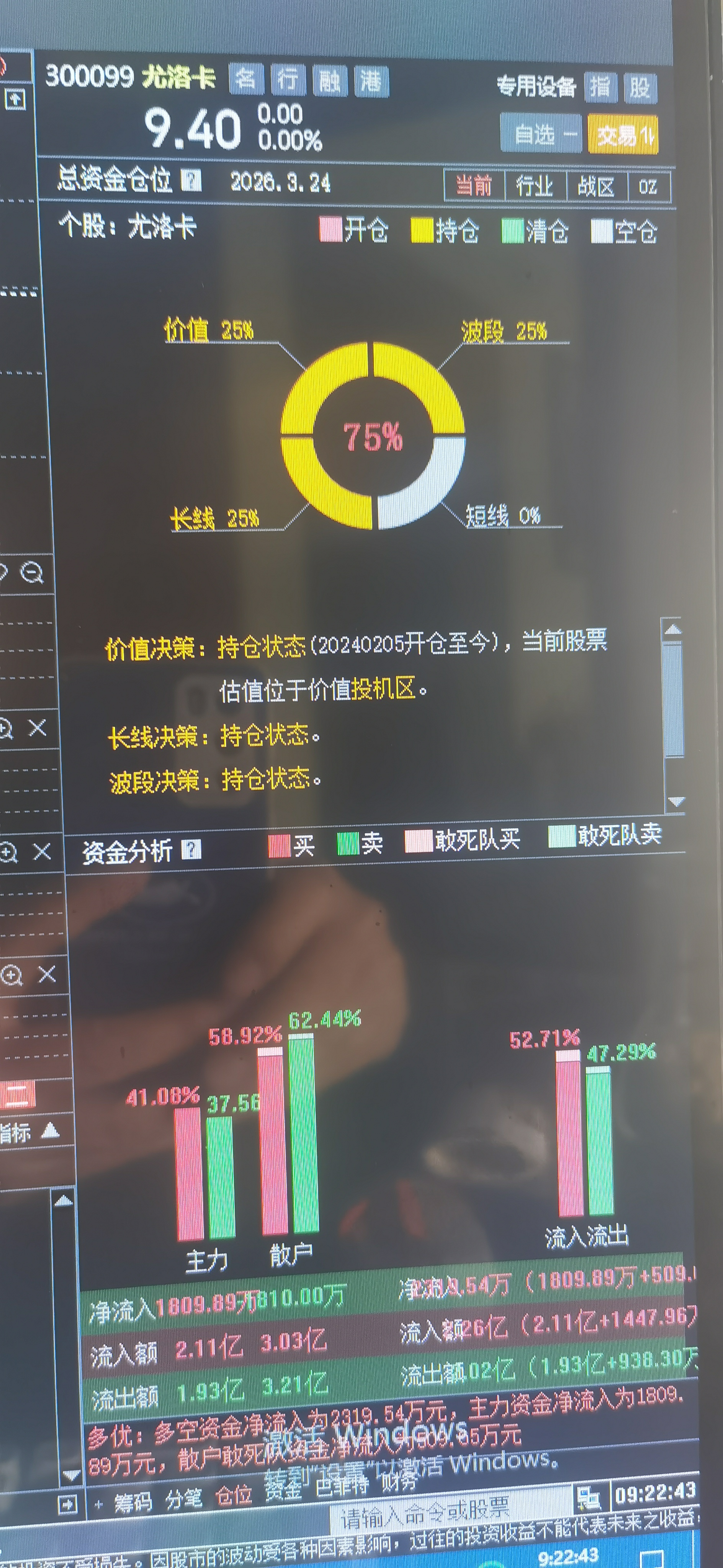 通达信显示昨天尤洛卡主力资金净流入2319万