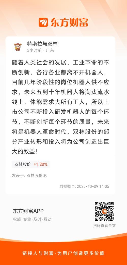 随着人类社会的发展,工业革命的不断创新,各行各业都离不开机器人,目前几年阶段性的岗位机器人供不应求,未来五到十年机器人将淘汰流水线上、体能需求大所有工人,所以上市公司不断投入研发机器人的每个环节,不断创新每个环节的质量,未来将是机器人革命时代,双林股份的部分产业转形和投入将为公司创造出巨大的效益!