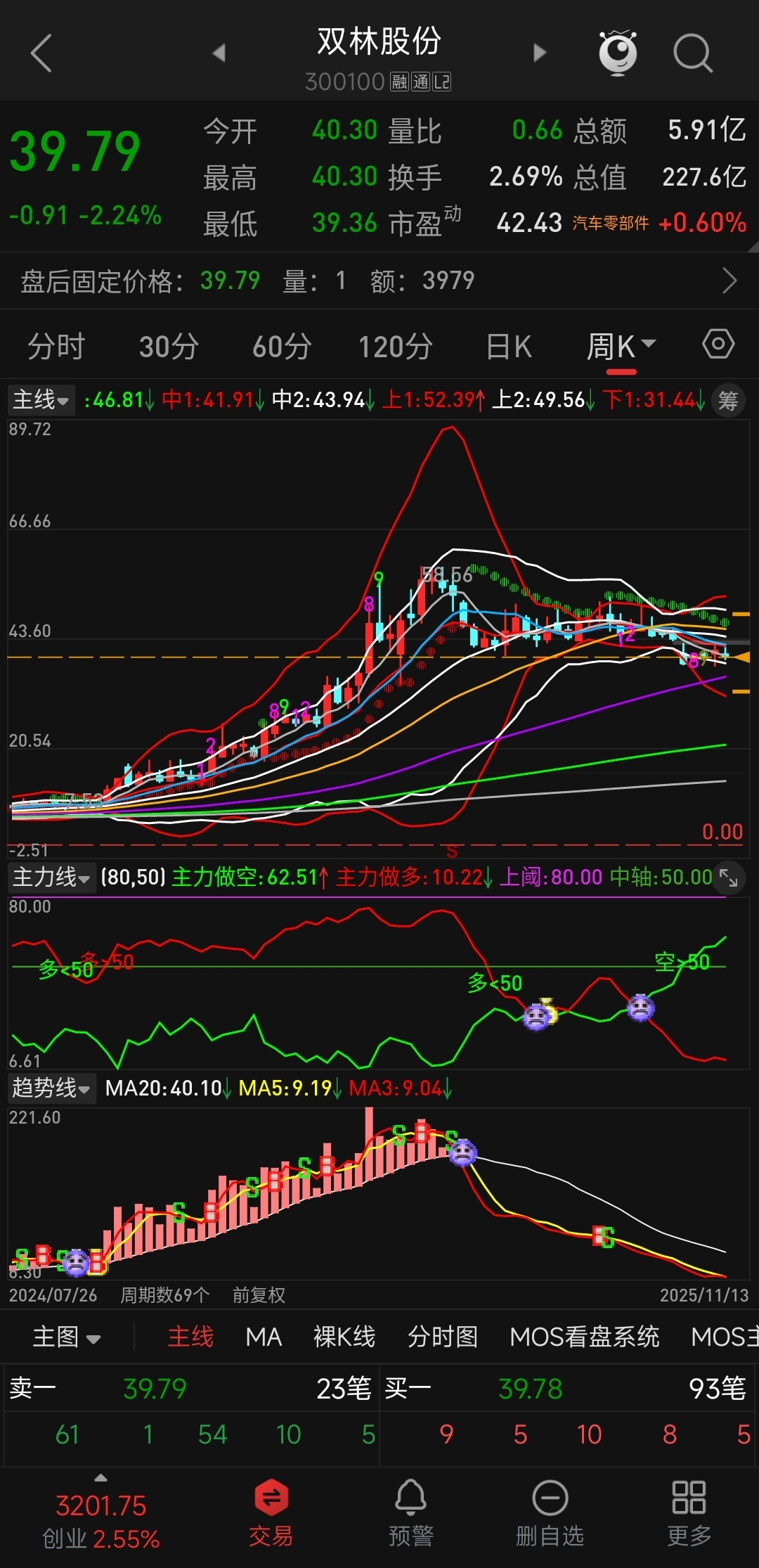 日线收口,主力做空线长期在天花板运行。周线向下开口,主力做空线持续上行,趋势线持