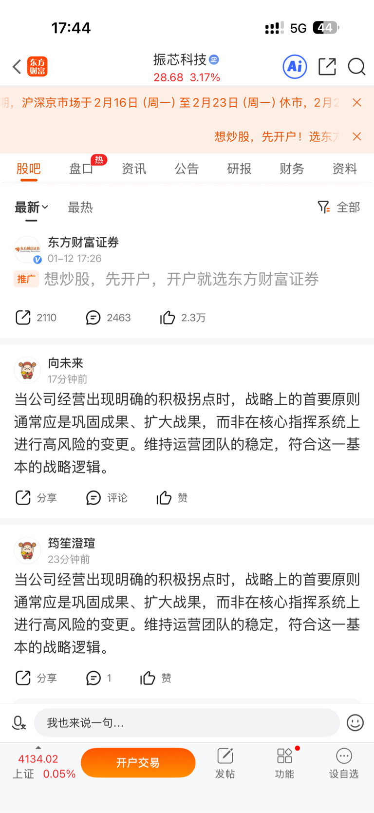 温馨提示: 1.根据《证券法》规定,禁止编造、传播虚假信息或者误导性信息,扰乱证券市场;2.用户在本社区发表的所有资料、言论等仅代表个人观点,与本网站立场无关,不对您构成任何投资建议。用户应基于自己的独立判断,自行决定证券投资并承担相应风险。《东方财富社区管理规定》