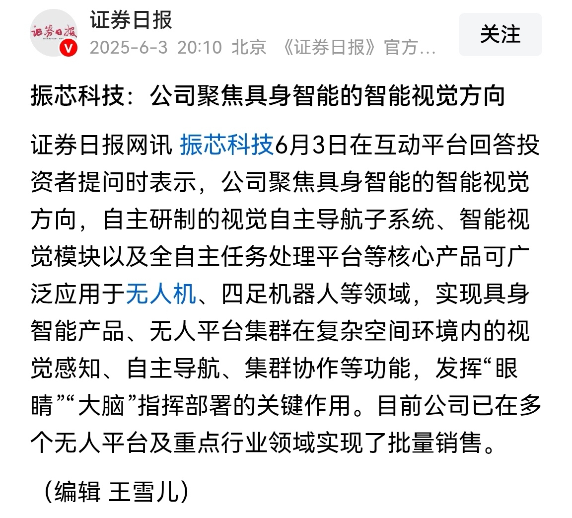 $振芯科技(SZ300101)$ 人形机器人落地最难的就是机器人“大脑” 振芯科技已经提前卡位AI视觉=军工级感知+北斗融合定位+端侧大模型+低延迟闭环,是机器人的“眼睛+导航+决策核心”。