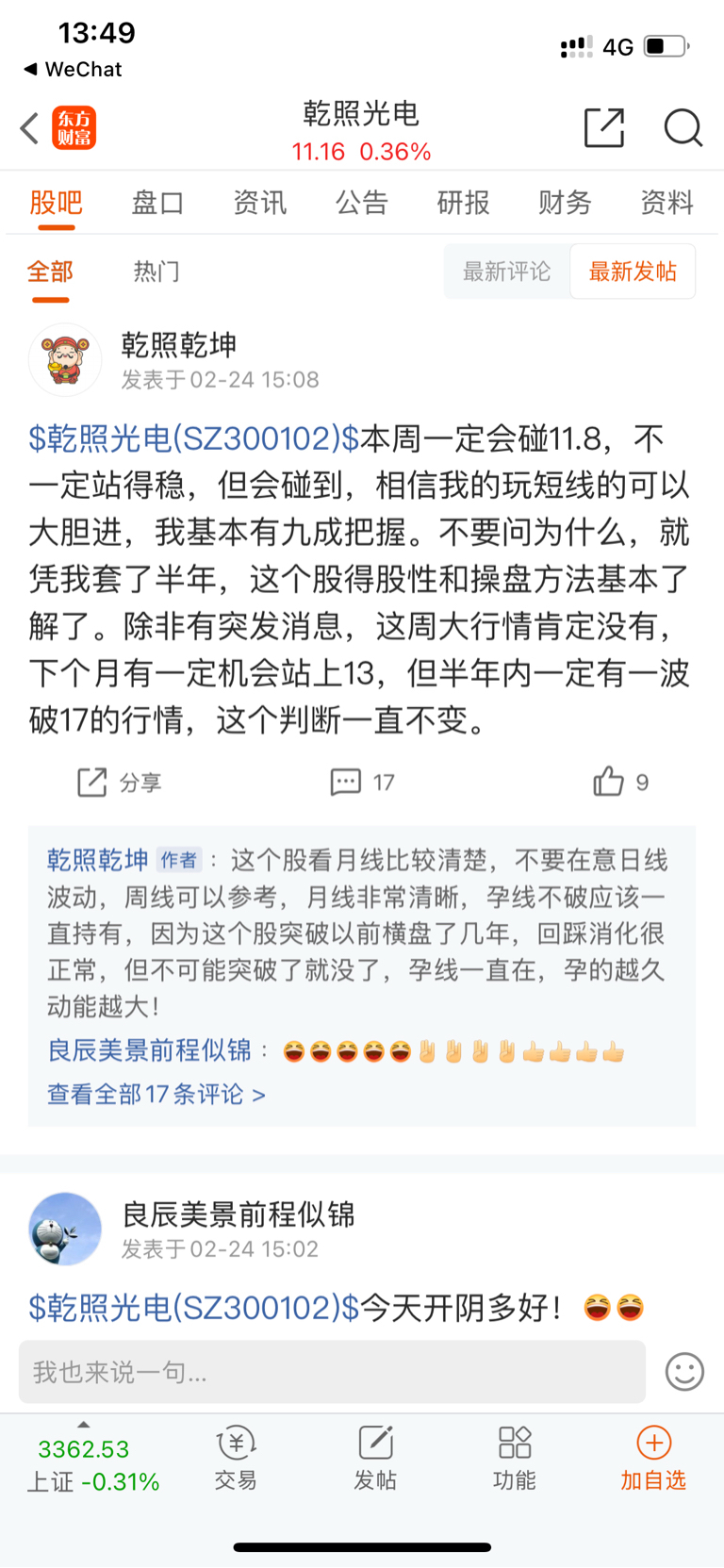 $乾照光电(SZ300102)$ 我倒想看看今天能不能到11.8,每次只要乾照涨一点点就开始出来吆喝,搞得自己跟神算子一样,怕别人拆穿他,只敢拉黑我们这些不认同他的,忽悠那些新进来的散户,请大家认清这个人的嘴脸,跟他反着做,他说捂着就卖掉,他说做t就捂着。他就是只托