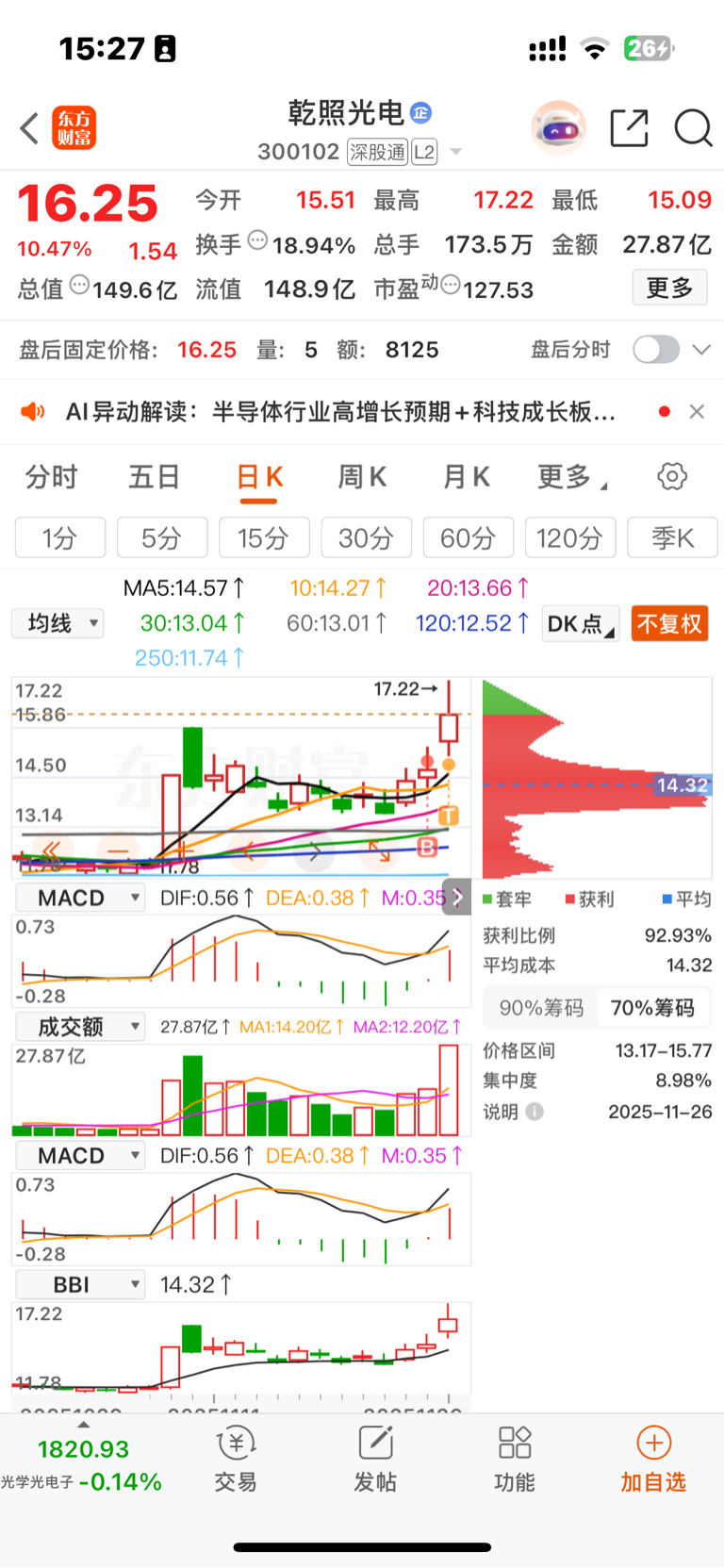 $乾照光电(SZ300102)$ 昨天拿了三个票,就这个票操作失误,我以为他走的航天科技,我看板块太弱,就七个点卖了,早盘也没卖到最高点,盘中也被他欺骗了,最后尾盘拉升最高17个点,反正没有吃到肉。