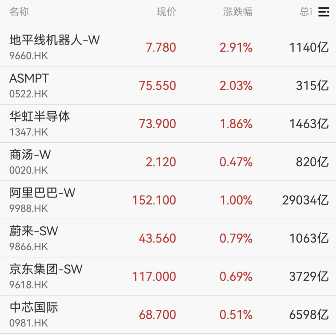 港股方面,三大指数走低,地平线机器人、华虹半导体、阿里巴巴涨超1%。