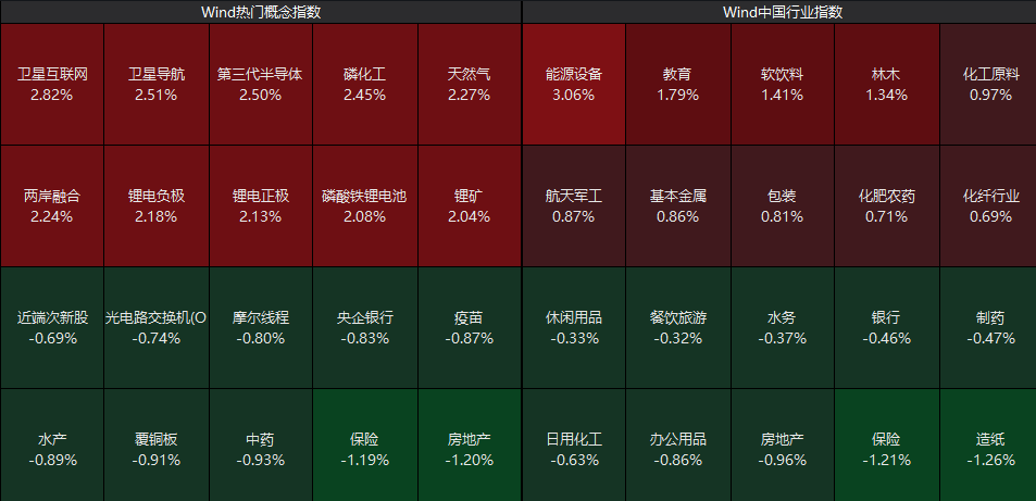 从板块上来看,商业航天概念股表现活跃,半导体、锂电、能源设备板块涨幅居前,而房地产、保险、中药板块走低。