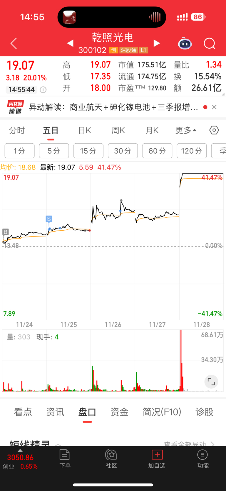 $乾照光电(SZ300102)$ 周一建仓的,周三高位卖了,周四都好纠结要不要接回了,今天高开,不敢接,唉