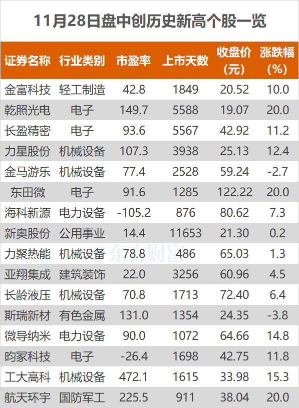 11月28日,A股三大指数今日集体上涨,截止收盘,沪指涨0.34%,收报3888.60点;深证成指涨0.85%,收报12984.08点;创业板指涨0.70%,收报3052.59点。东方财富Choice数据显示,今日有16只个股盘中股价创历史新高,分别为乾照光电、长盈精密等。