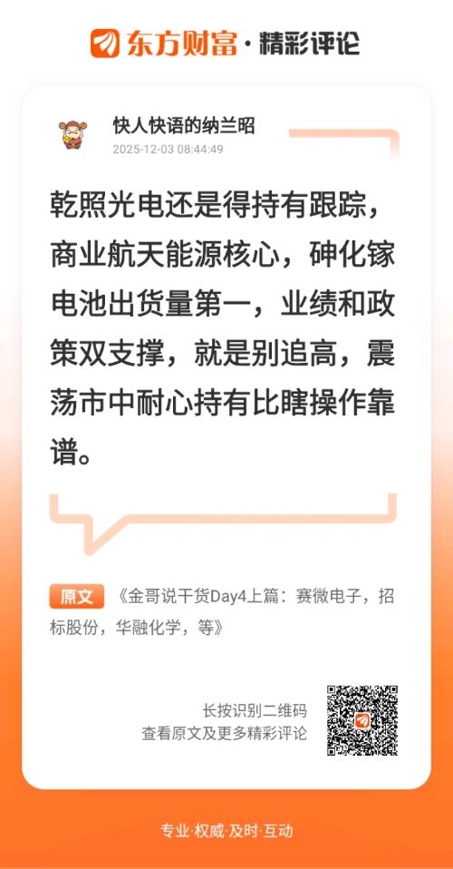 //@快人快语的纳兰昭 :乾照光电还是得持有跟踪,商业航天能源核心,砷化镓电池出货量第一,业绩和政策双支撑,就是别追高,震荡市中耐心持有比瞎操作靠谱。 $乾照光电(SZ300102)$$恒逸石化(SZ000703)$$东百集团(SH600693)$