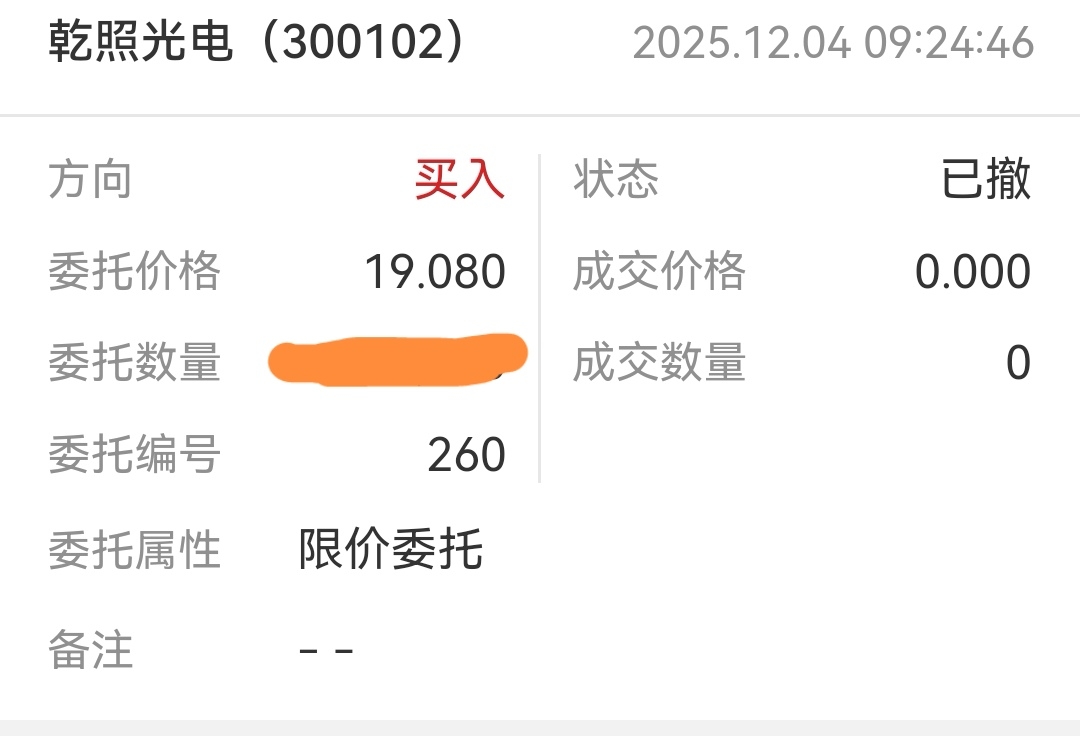 $乾照光电(SZ300102)$ 早盘集合竞价埋单19.08元(当时是19元),最后几秒拉到19.20元开盘,9:30开始急拉,我急忙撒单,准备追涨,没想到一笔瞬间打到19.07,我不撤单就成交了。运气不好。损失一部华为X6。