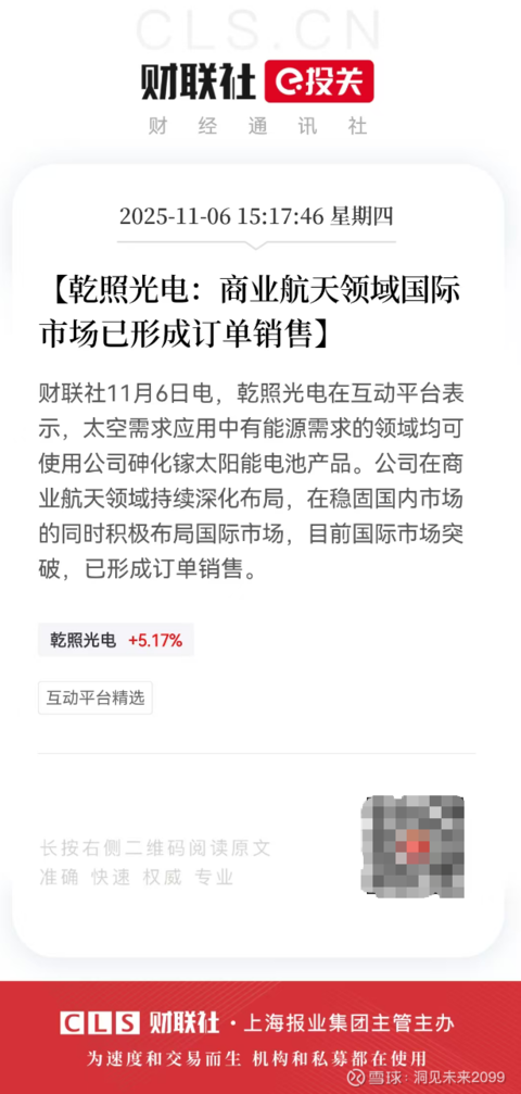 乾照光电的砷化镓太阳能电池产品通过下游核心客户电科蓝天、航天科技八一一研究所给垣信卫星主导的G60千帆星座项目供货!乾照光电是国内卫星用砷化镓太阳能板领域的核心供应商,市占率超60%,其产品已批量应用于G60千帆星座等低轨商业卫星,是该项目卫星能源系统的重要组成部分。