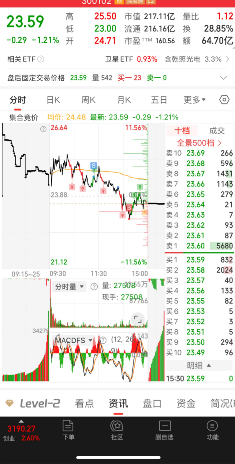 $乾照光电(SZ300102)$ 出完了,23挂的一首,没想到成交了,明天预期 商业航天分歧,这些跟风的肯定先挂,水下10个点接一点,再看情况