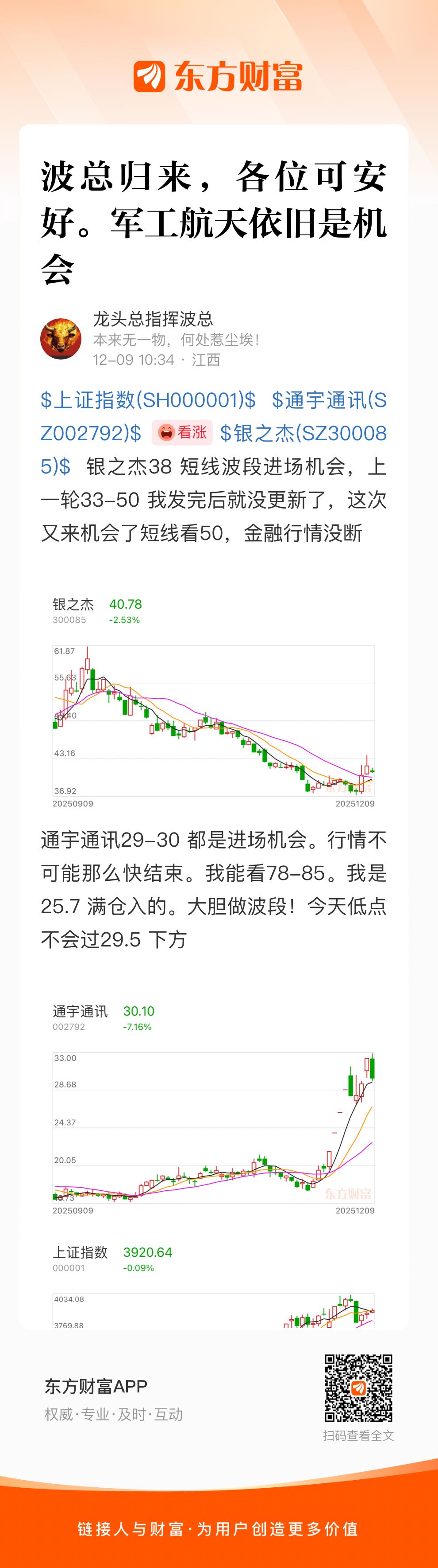 通宇通讯29-30 都是进场机会。行情不可能那么快结束。我能看78-85。我是25.7 满仓入的。大胆做波段!今天低点不会过29.5 下方