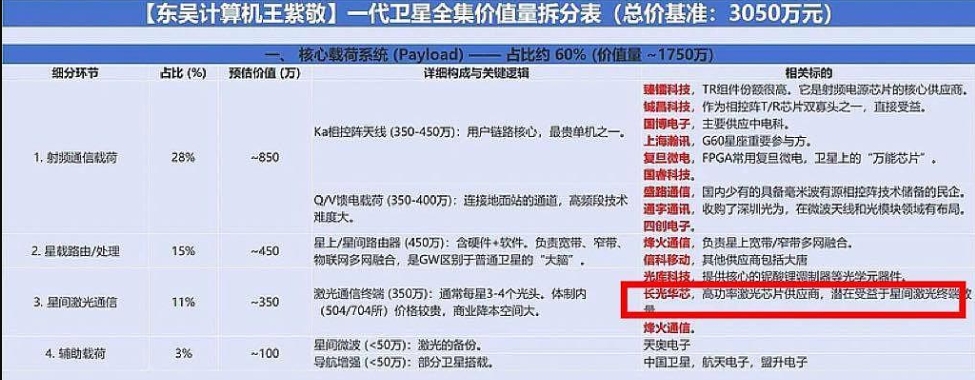 1,乾照光电的高功率激光芯片是星间激光通信技术的核心组件,占单科卫星的11%约350万。