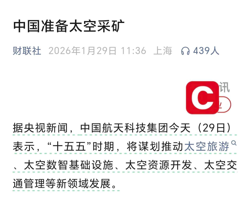 $乾照光电(SZ300102)$ 据央视新闻,中国航天科技集团今天(29日)表示,“十五五”时期,将谋划推动太空旅游、太空数智基础设施、太空资源开发、太空交通管理等新领域发展。