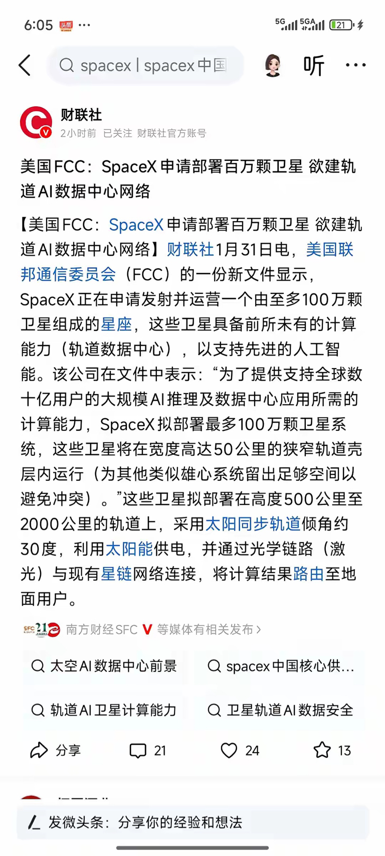 $乾照光电(SZ300102)$ 商业航天再迎重大利好,马斯克又有惊人之举。他打算申请部署数百万颗卫星,还要构建轨道AI数据网络。这无疑会对下周的商业航天与航空领域产生巨大刺激。商业航空航天已沉寂许久,此次至少会迎来一次大幅反弹吧。