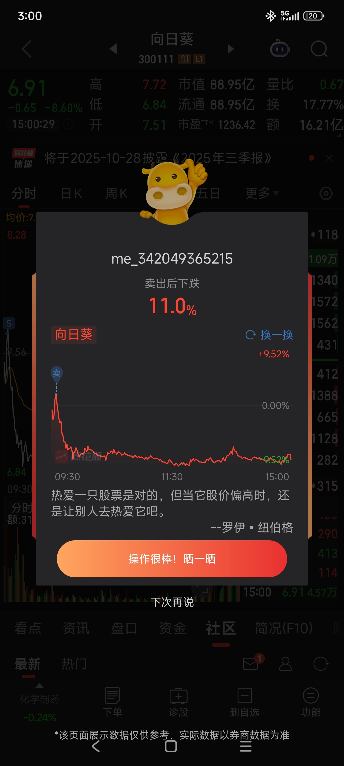 $向日葵(SZ300111)$ 昨天尾盘集合竞价进的,就是看这里的庄家每天都是早盘拉高然后出货一天。今天不跑吃大面了都!!