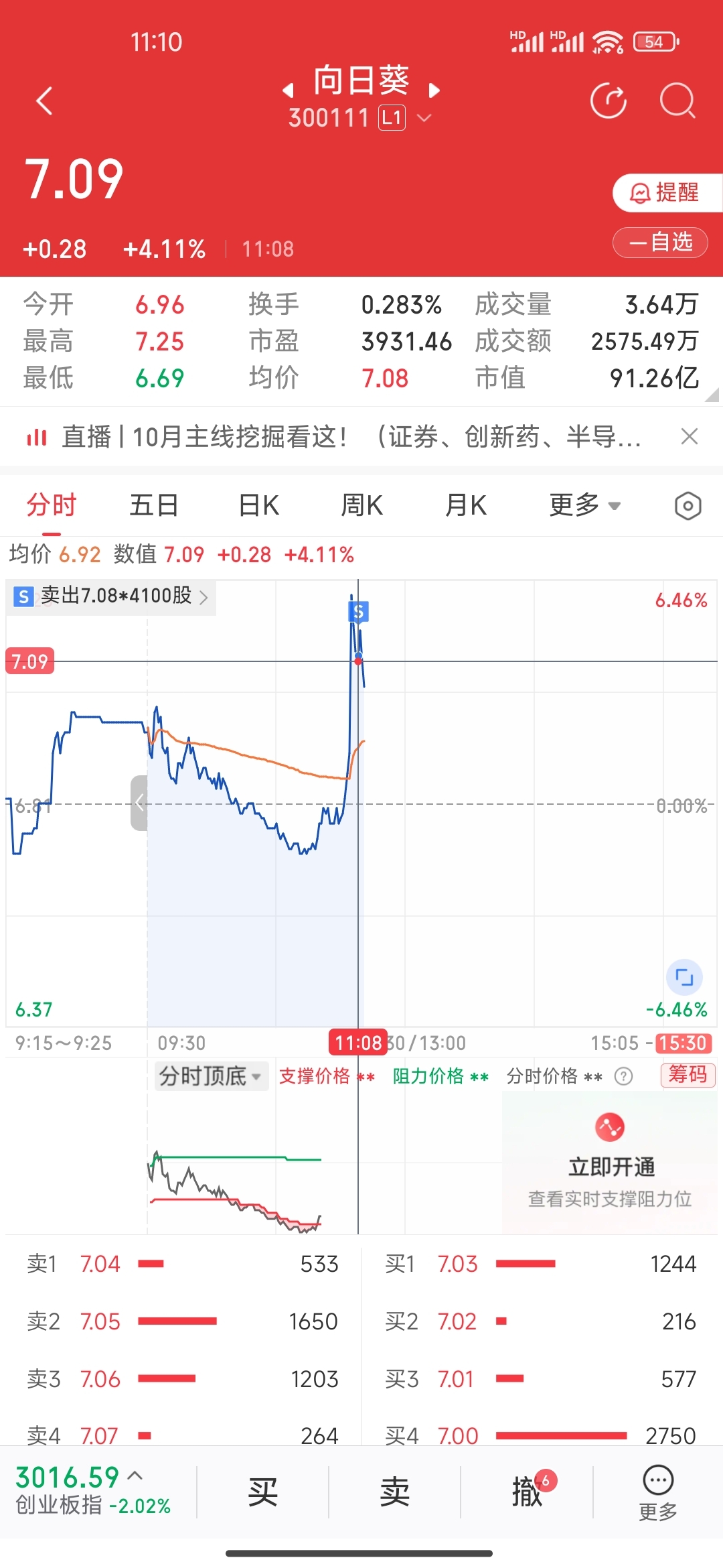 $向日葵(SZ300111)$ 走了走了,定价7.30没成功,躲过7.25,撤单后最终7.08卖了