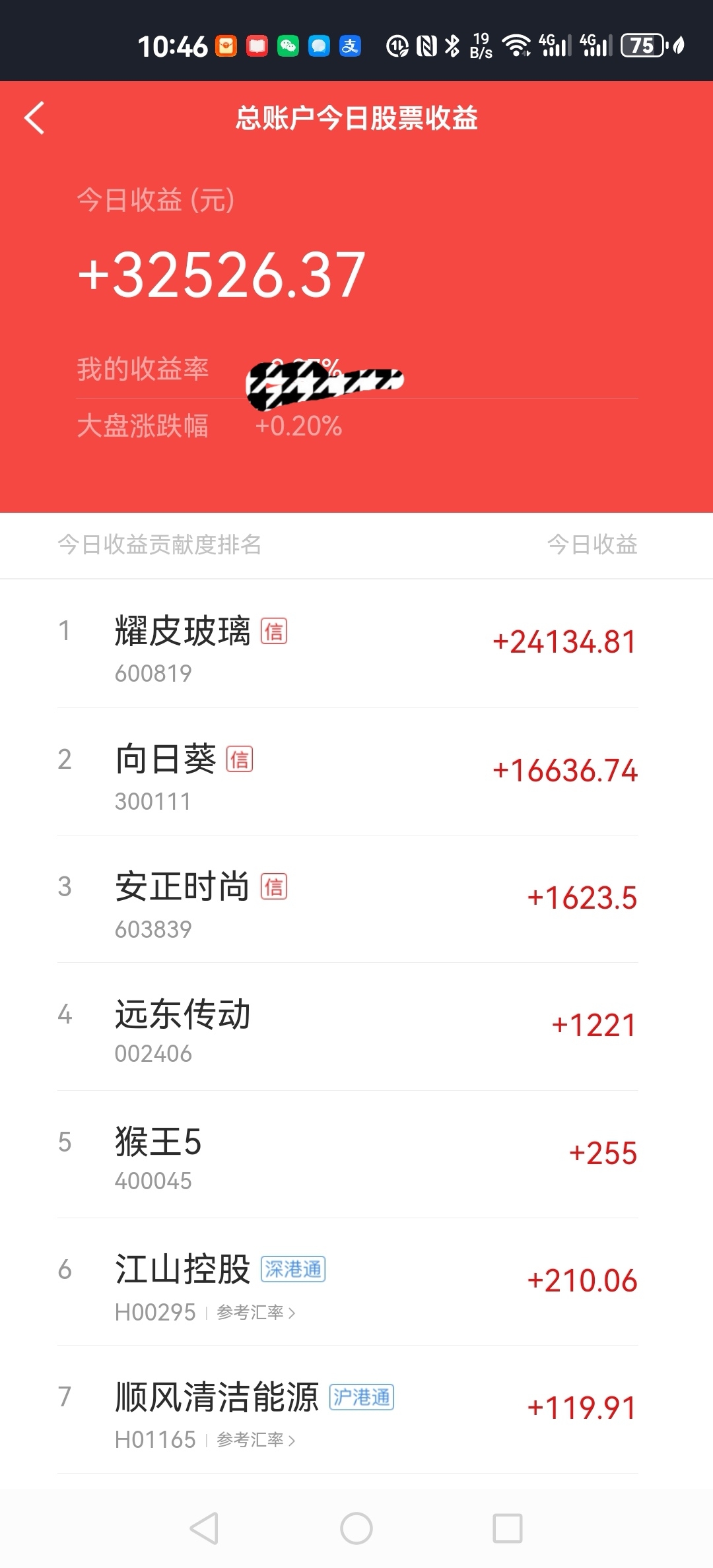 $向日葵(SZ300111)$ 今天卖部分耀皮玻璃,全部三江购物,买入7.3到7.4的向日葵25000股,炸板又回封8.11,加仓安正时尚至24700股,一度差一分钱封板,现6个点左右横盘,从各方面分板,大盘不要太差,仍能冲高甚至涨停。好在2股今天已实现赢利。