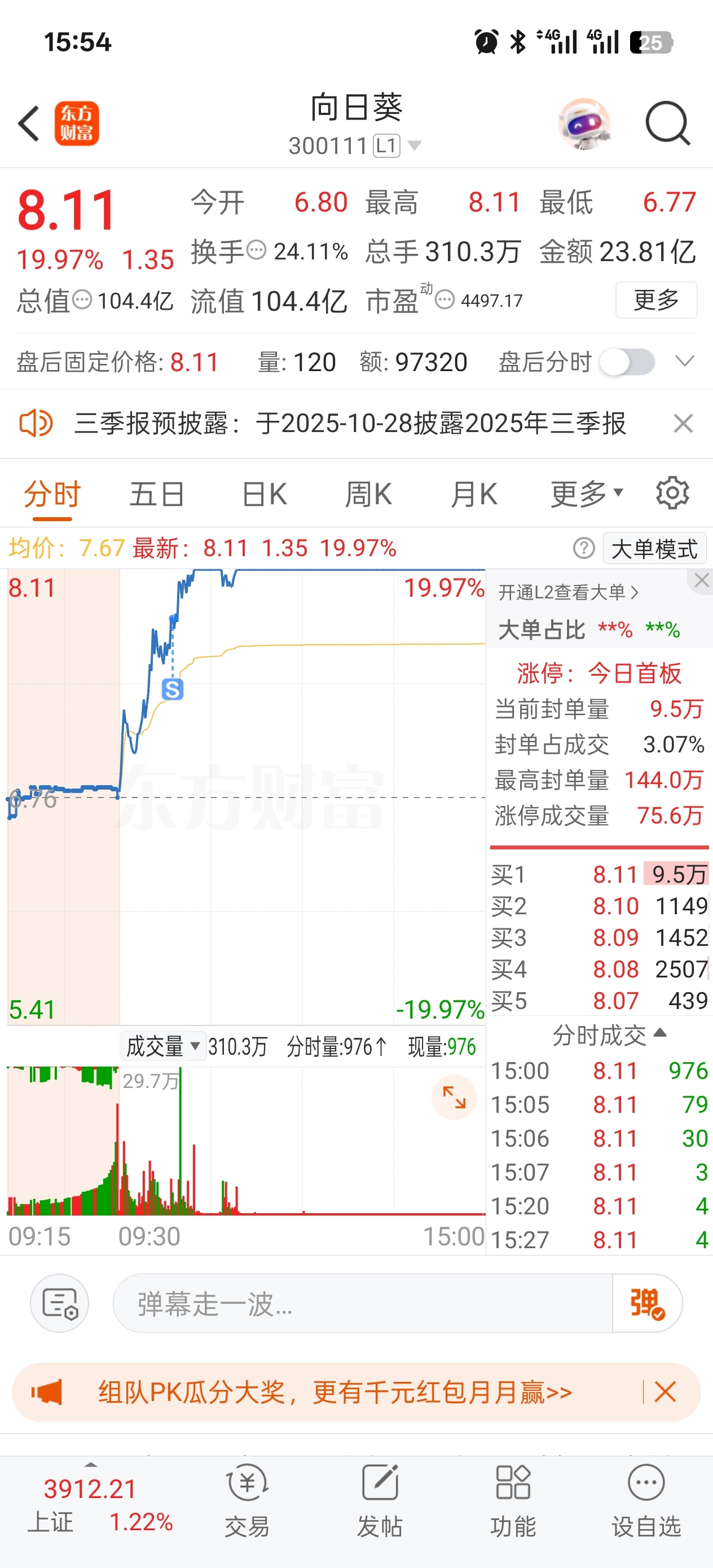 $向日葵(SZ300111)$ 也许可能卖飞了,昨天追高就是想着重组套利,赚10个点就走了,今天有量,可是换手太大了。祝兄弟们长虹。昨天跑的那个是不是追了我的筹码