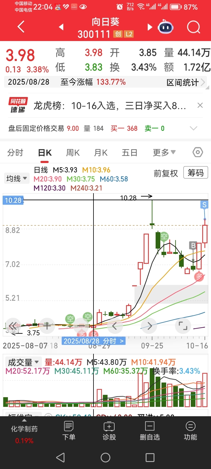 $向日葵(SZ300111)$ $向日葵(300111)$ 尾盘回落8.87非要拉升,集合竞价还要拉升2分,8.88收盘就不会两天涨幅≥30%出异动公告,明天冲高双头(或接近双头)回落,做个双头选择方向,可能是回调方向,底部