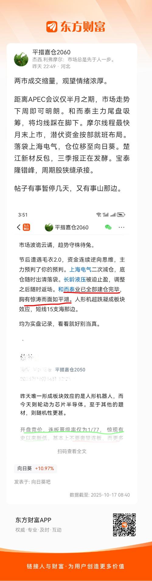 距离APEC会议仅半月之期,市场走势下周即可明朗。和而泰主力尾盘吸筹,将均线踩在脚下。摩尔线程最快月末上市,潜伏资金按部就班布局。落袋上海电气,仓位移至向日葵。楚江新材反包,三季报正在发酵。宝泰隆错峰,周期股狭缝承接。