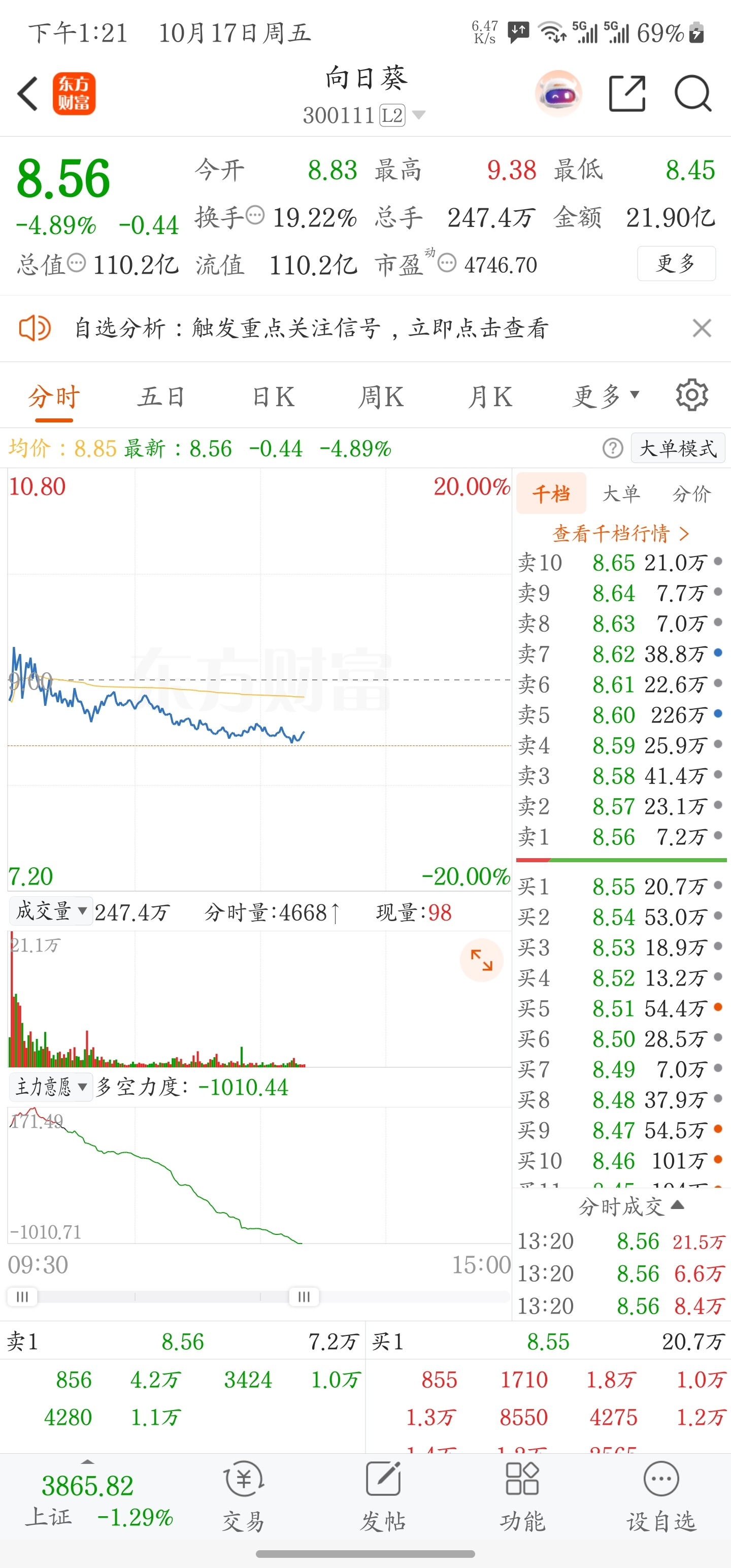 $向日葵(SZ300111)$ 今天砸了三次8.5 第三次撑不住砸穿 但是里面主力两笔单子吃掉拉回来 很明显有人护盘 等周一市场修复就能反包了 五日线趋势没破 双头也没见 何必跑出去挨打 到了我的成本线我都不带慌的 只要今天看了盘口的人就知道今天承接可以 只是市场太差缘故